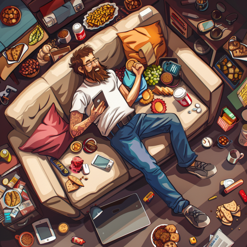lazy officeman lying on sofa with phone in his hands, tablet, snacks and many other things on the littered sofa, 2d graphics --style raw