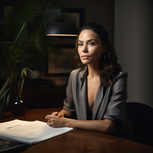 An ultra-realistic, high-resolution photograph of a professional woman in her late 20s sitting at a sleek, modern desk in a well-lit home office. She has natural skin texture, detailed facial features, and lifelike hair, making her indistinguishable from a real person. She is deeply focused, typing on a laptop with a calm and confident expression.The scene is captured with a professional DSLR camera, using a 50mm prime lens at f/1.8 aperture to create a natural depth of field. Soft sunlight filters through the window, casting a warm glow and gentle shadows, emphasizing clarity and concentration. Subtle visual cues like a tidy workspace, a steaming cup of herbal tea emitting wisps of steam, and realistic reflections enhance the authenticity. High-definition with sharp details and a warm ambiance. --v 5.0
