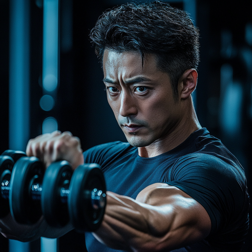 A man in his 40-50's is wearing a tiny black pain relief patch on his upper arm. He is standing up and looking at it with curiosity. He has short hair and facial stubble. The setting appears to be a modern home interior, and there is some natural light illuminating him from behind. His posture suggests that he may have just finished working out or engaging in other physical activity, which led him to take off his t-shirt for relief, .This photo was taken using Canon EOS R5 mirrorless camera, with an EF lens set to f/20, ISO 8D, capturing every detail of his smile and her warmth., ultra-realistic photograph captured, high-resolution 3d rendering --v 6.1
