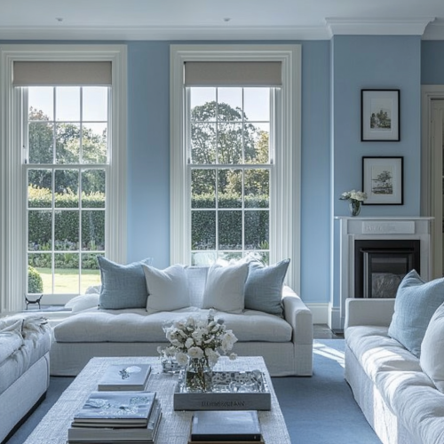 create an interior using a light blue with an RGB colour value of R: 171, G: 200, B: 239 as a monochromatic colour scheme, with 1 or 2 small light sage green accents with RGB values o R: 185, G: 225, B: 192, the atmosphere is calming, gentle and relaxing, it must benefit mental health, interior design, interior architecture