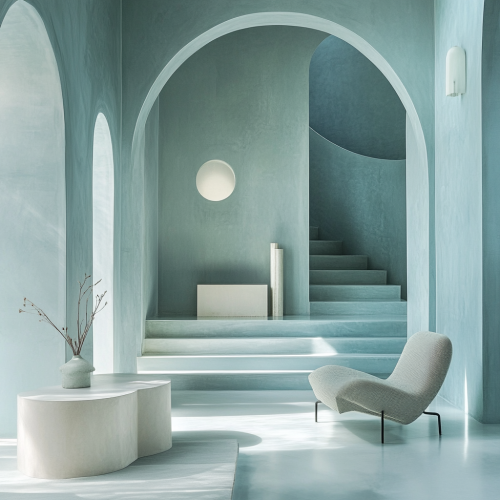 create an interior using a light blue monochromatic colour scheme, with 1 or 2 small light sage green accents, the atmosphere is calming, gentle and relaxing, it must benefit mental health, interior design, interior architecture