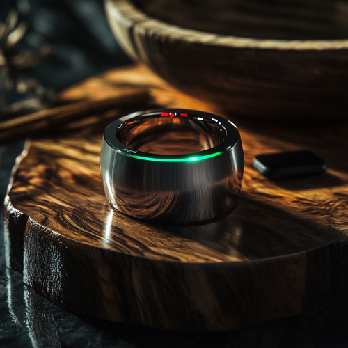 A hyper-realistic, high-definition close-up of a sleek, minimalist wearable ring inspired by the OURA Ring, carefully placed on a rich, natural oak table with a warm wood grain texture. The ring is crafted from polished silver metal with a soft, brushed finish, and a subtle LED interface in neon green with a hint of red glow along the edge, softly highlighting metabolic data metrics. Nearby, a small, rounded charging case with a matte black finish has a tiny red charging indicator light, connecting to a thin black cable that runs out of the frame. The background has natural wooden decor elements like a stack of bamboo coasters and a simple, handcrafted wooden bowl, giving the scene an earthy, balanced feel. Cool, diffused lighting casts soft shadows, accentuating the ring’s smooth contours and precise detailing, while the natural wood textures add a sense of calm and authenticity. This grounded, high-end setting emphasizes the ring’s sleek, modern functionality in a relatable, earthy environment, perfect for health-conscious users –-ar 16:9. --p 4eodxun --v 6.1 --s 50