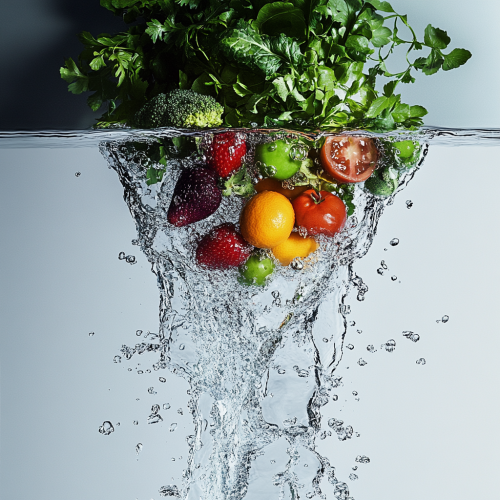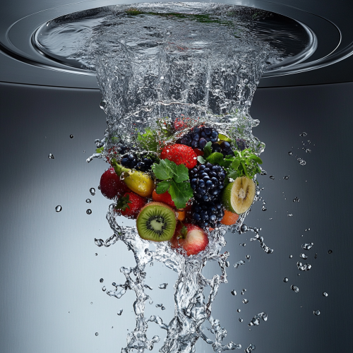 Natura e tecnologia: Un'immagine con sfondo neutro in cui al centro si vede un vortice d'acqua con frutta e verdura mista sottolineando come l'HPP sia una tecnologia innovativa al servizio della natura che utilizza la forza del vortice d'acqua. formato A3