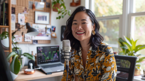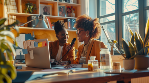 confident women in a bright, modern home office, radiating joy while speaking into a podcast microphone. Their insulin pump or medical device visible but styled fashionably with their business casual outfit. Behind them, a warm sunlit window and aesthetically pleasing bookshelf with awards. her desk shows a high-end laptop displaying growing analytics, surrounded by handwritten thank-you notes from people they've helped. On the wall, a vision board combines medical advocacy images with luxury lifestyle photos. Golden hour lighting creates a warm, aspirational glow. Cinematic composition, shallow depth of field, high-end interior photography --ar 16:9 --style raw --v 6.0
