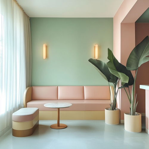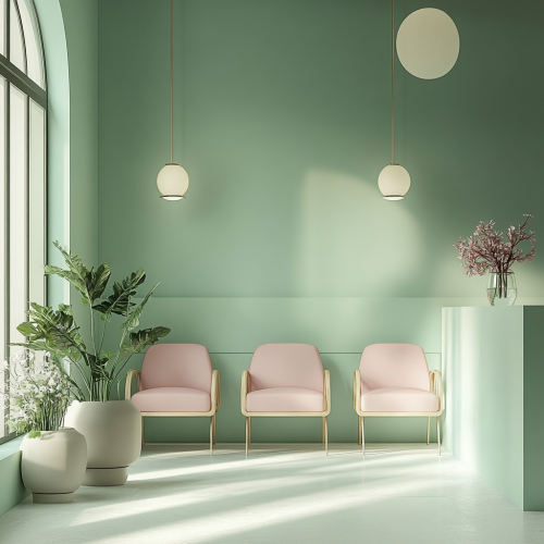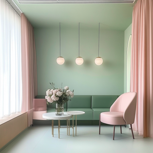 create a waiting room-like interior using a light sage green and baby pink complementary colour scheme without any windows, the atmosphere is calming, gentle and relaxing, it must benefit mental health, interior design, interior architecture