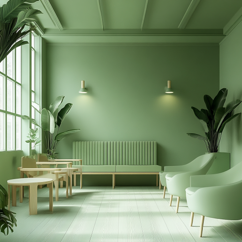 create a waiting room interior using a green monochromatic colour scheme with varying shades, especially light green, including 1 or 2 small white timber accents, the atmosphere is calming, gentle and relaxing, it must benefit mental health, interior design, interior architecture