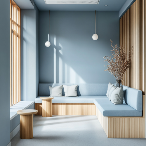 create an educational interior using a light blue monochrome colour scheme with light oak accents which is calming, gentle and relaxing, it must benefit mental health, interior design, interior architecture