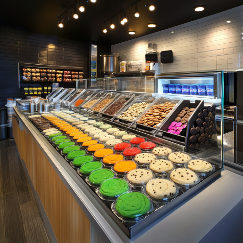 a build your own cookies station with a toppings bar. it uses the subway sandwich brand colors and is viewed from looking at the counter like a customer would
