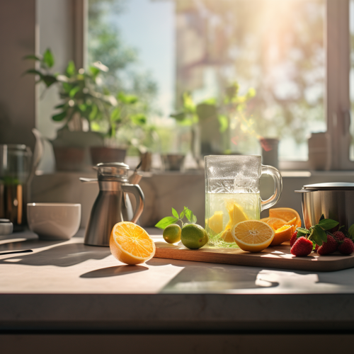 A photorealistic image of a modern kitchen countertop bathed in natural sunlight from a nearby window. Fresh fruits, herbs, and a cup of steaming herbal tea are artfully arranged, creating a wholesome atmosphere. An empty space at the center of the counter is ideal for placing a supplement bottle. High-definition, warm and inviting ambiance. --v 5.2