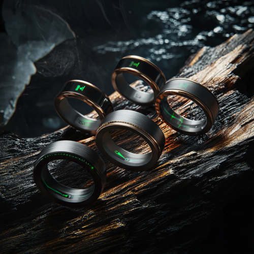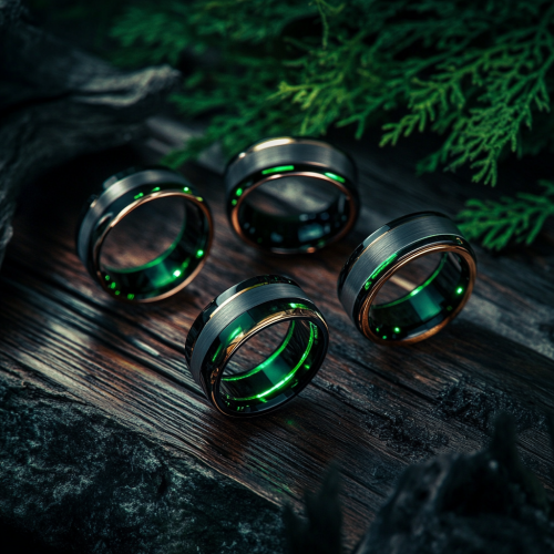 A beautifully detailed, photorealistic image of three sophisticated health rings inspired by the OURA Ring, captured from a top-down view. The rings are gracefully laid out on a rustic wooden surface, emphasizing their elegant and high-end design. Each ring is crafted from high-quality titanium, featuring a minimalist style that speaks to modern sophistication. The first ring showcases a subtle emerald green accent, adding a touch of vibrancy that enhances its elegance. The second ring is adorned with a soft metallic gray finish, exuding a contemporary feel that complements its sleek design. The third ring incorporates a fine gold line around its edge, providing a luxurious contrast to the matte surface. The image is set against a dark background with cold undertones, enhancing the overall aesthetic and creating an inviting atmosphere that draws attention to the rings. The minimalist approach to styling reflects the high status and premium nature of the products, appealing to individuals who appreciate both aesthetics and advanced health technology in their everyday lives –-ar 16:9. --p 4eodxun --v 6.1 --s 50