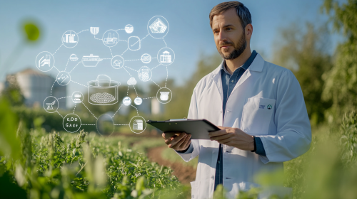 In the foreground stands a professional consultant holding a tablet or clipboard, symbolizing the individual counselling and training services offered by the centre. Around the consultant may be icons representing key certifications such as HACCP, GLOBALG.A.P., IFS and ISO 22000, connected by lines to highlight the interconnectedness of these standards. In the background may be an illustration of a farm and food processing plant, visually representing the business sectors that the centre supports, including agriculture and food production. The colour palette is bright and professional, using shades of white, green and blue to evoke a sense of cleanliness, security and growth. Overall, the design is simple but effectively communicates the center's professional focus on quality systems and food safety. --ar 16:9