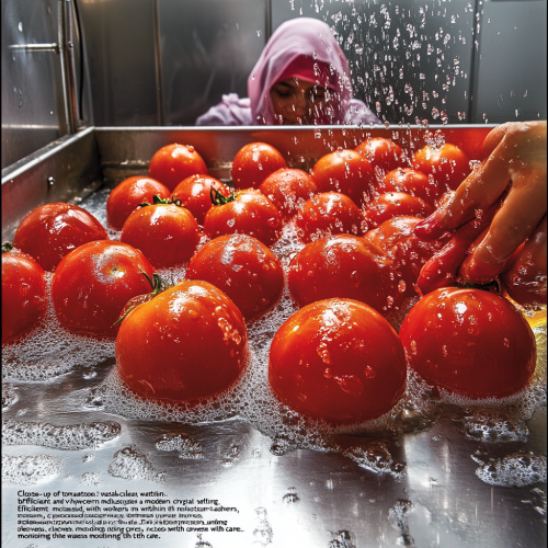 "Close-up of tomatoes being washed in crystal-clear water within a modern industrial setting. Efficient machinery and hygienic practices are showcased, with workers in full-coverage uniforms, including headscarves, monitoring the washing process with care. The vibrant tomatoes stand out against the sleek, stainless-steel background."The woman Hand coverd. ar 3:2