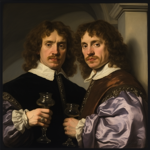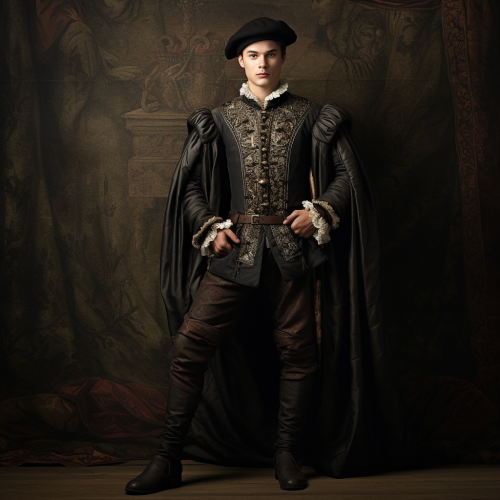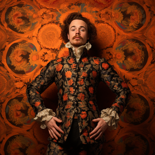 full body portrait of an 1600s Fashion man / 1600 - 1699 17th century / confident pose / background depicts an intricate kaleidoscope pattern