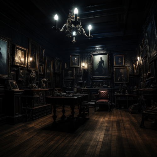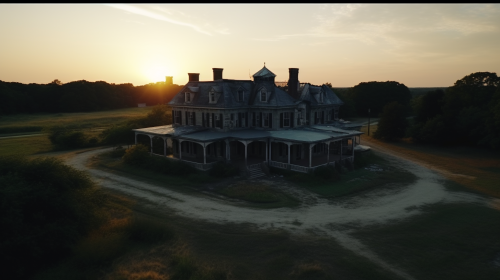 Drone footage of Black Hollow Mansion at dusk. The sun casts eerie shadows over the decaying structure, Ultra HD REALISTIC 4K image quality --ar 16:9