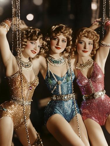 full-color a candid photograph of 3 beautiful female acrobats hanging out backstage at the circus in the 1920's. they are in glamourous, elaborate costumes. their poses are natural, the photos aren't staged. sparkles, glitz, glam, beaded, circus costume bodysuits with pearls, gems, metallic, silk, le cirque --ar 3:4