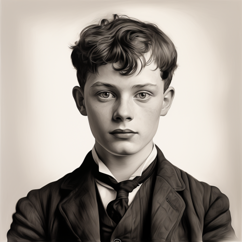 portrait of an adolescent teenage boy in the 1900s, typical look, illustration, black and white, --ar 1:1