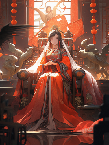 ancient Chinese beautiful queen wearing Chinese traditional dress, sitting on their throne alone, elegant and furious expression, she is at the middle of palace hall full of her nobleman, ancient Chinese palace background --niji 5 --ar 3:4