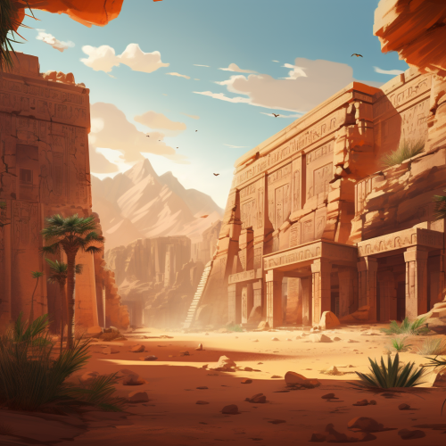 ancient Egyptian ruins in the middle of a desert during the day, cozy and dusty