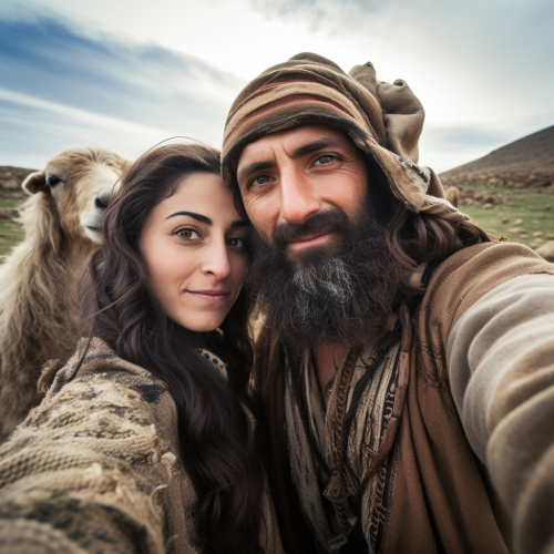 middle eastern Biblical Abraham and Sarah selfie with sheep in the background