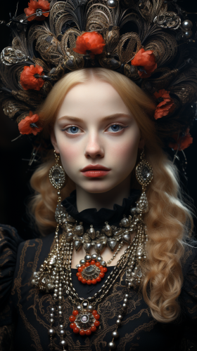 A portrait of a 17th-century European woman with an eerily pale complexion and ornate clothing , --ar 9:16 --s 750