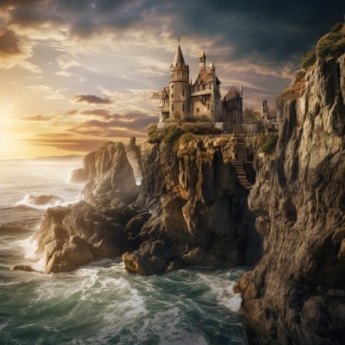 final scene to movie. Good knight and evil knight battle with medieval weapons and swords. A castle burns in the background.
