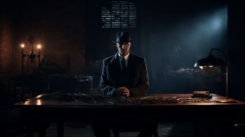 gangster sitting a desk smiling, dimly lit gangster's office, dramatic lighting, brick walls, 1930s, photorealistic --v 5.2 --ar 16:9