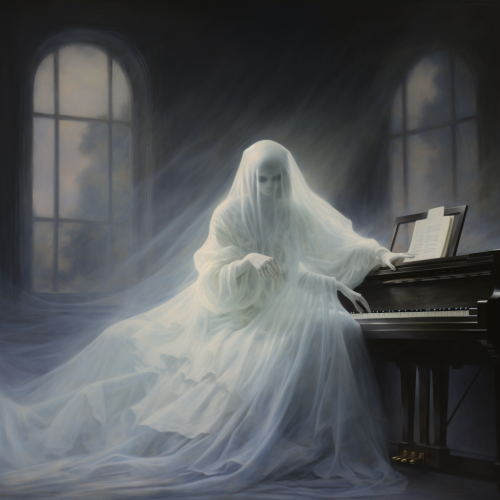 painting of a ghostly, spectral woman in white Victorian 19th century dress sitting at a piano