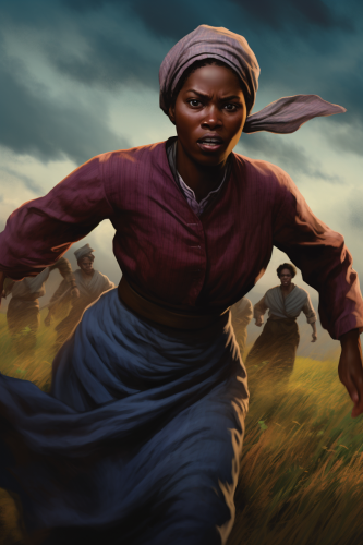 aerial image of Harriet Tubman escaping from slavery, running through a feild. a group of men far behind her chasing her. use vivid colors and high definition. --ar 2:3 --v 5.2