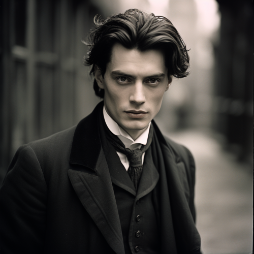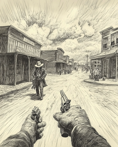vintage round trading card of an old western town Main Street duel at high noon looking over sheriff’s shoulder down at the gunslinger in the illustrative art style of Virgil Finlay, pencil sketch --ar 4:5