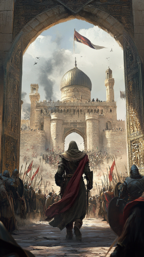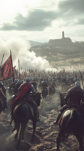 The Battle of Hattin unfolds with Saladin’s army overwhelming the crusaders. Smoke rises from the battlefield as knights fall and Saladin’s forces close in. In the distance, Jerusalem stands as the ultimate prize. Surreal, hyper-realistic, Ultra HD --ar 9:16