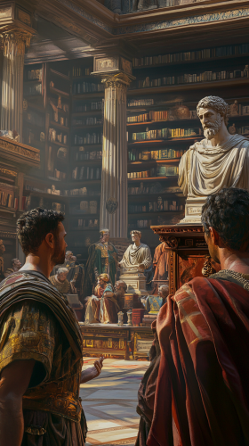 14. was just as Roman as the Western Empire, a scene of Eastern and Western Roman philosophers debating, 5th century AD, in traditional Roman and Byzantine robes, inside a large hall filled with statues and bookshelves, with busts of Roman Emperors in the background, medium shot showing the intense exchange of ideas, hyper-realistic, photo realism, cinematography --ar 9:16