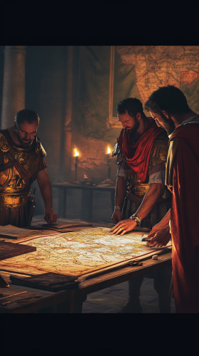 9. But in the West, they had other plans, a plotting scene of Western Roman officials in secret meeting, 5th century AD, wearing senator togas and military attire, in a dimly lit room with a large map and a table filled with documents, flickering torches casting shadows on the walls in the background, medium shot capturing the conspiracy, hyper-realistic, photo realism, cinematography --ar 9:16
