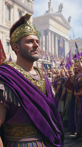 Emperor Constantine has decided, a powerful depiction of Emperor Constantine with a determined expression, 4th century AD, wearing a regal Roman tunic and purple cloak, in a grand Roman palace chamber, surrounded by advisors and Roman standards, marble columns and ornate decorations in the background, medium shot capturing his decisive demeanor, hyper-realistic, photo realism, cinematography --ar 9:16