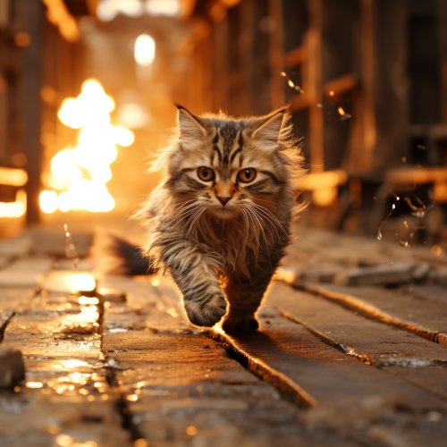a cat on fire running on wooden floor, 12th century, cinematic, realistic, depth of field, --s 250