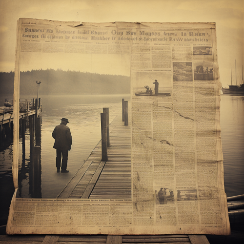 Use a "1886 Seattle Puget Sound Weekly" newspaper with a Title "Fisherman Disappears off Dock Never Found" with other news stories, main page with quote "Fisherman leaves pole on dock" historical lookinf faded large print newspaper, picture of empty dock from the 1880's