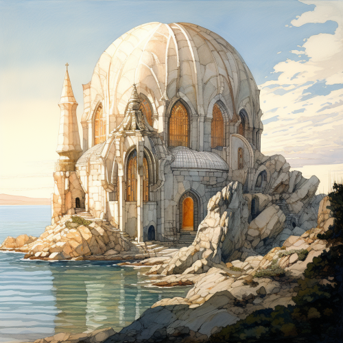 an ancient gothic church shaped like a nautilus, weathered, vintage, architectural sketch, carved white marble, subtle colors, on a promontory overlooking the sea, late afternoon sunlight, nautilus shape, stylized