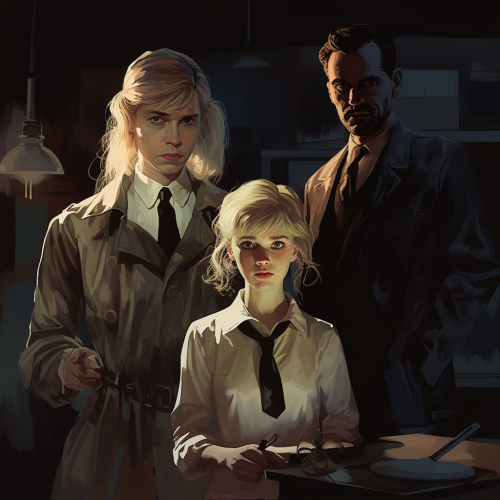 two government agents captured by fanatics, a blonde woman doctor with a little girl standing in front of them, set in dark shady room, 1920s, vector art, limited colour palette, --v 5.2