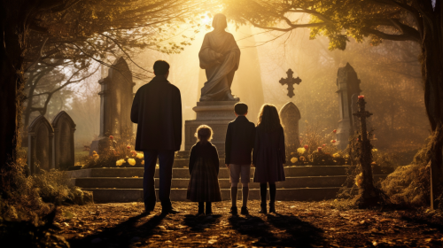 Harry Potter, Ginny, and their children standing in front of the ruins of his childhood home in Godric's Hollow, with the memorial for Lily and James Potter in the background, medium: photo hyper-realism, style: reminiscent of the emotional and nostalgic scenes from the "Harry Potter" films, lighting: soft twilight, casting long shadows and emphasizing the historical significance of the location, colors: earthy browns, deep greens, and soft blues, composition: shot with a Canon EOS 5D Mark IV DSLR camera, EF 50mm f/1.8 STM lens, Resolution 30.4 megapixels, ISO sensitivity: 100, Shutter speed 1/125 second, wide-angle perspective capturing the family's connection to the past and the legacy of the Potters --ar 16:9 --v 5.1 --style raw --s 750.