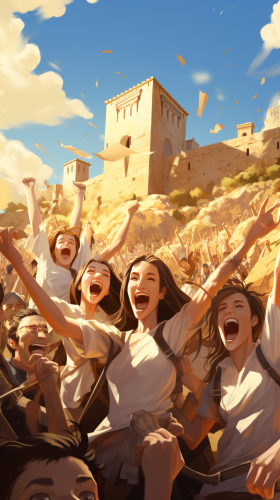 Cartoon-realistic depiction of a jubilant Jewish crowd celebrating in the historic streets of Jerusalem, with joyous faces, traditional attire, and the backdrop of iconic landmarks. --ar 9:16 --s 233 --chaos 4 --style raw
