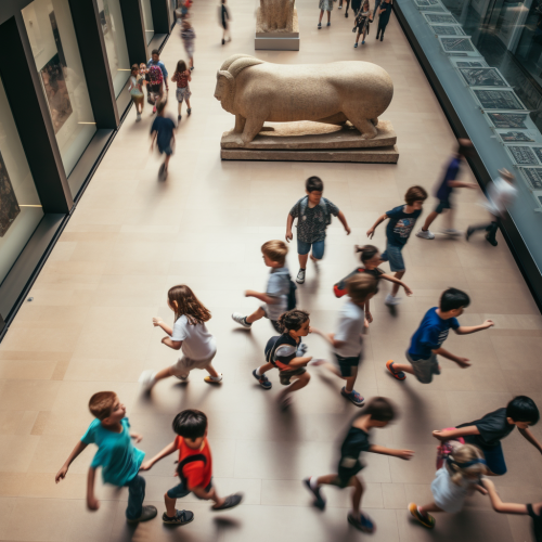 group of kids running in diferent directions british museum full ancient sculptures and artifacts and Shot from above looking down on kids cinematic --s 50 --style raw