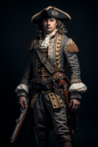 18th century medieval mashup design of a soldier, flintlock fantasy, powder punk, hyper realistic, full body, hybrid equipment --ar 2:3
