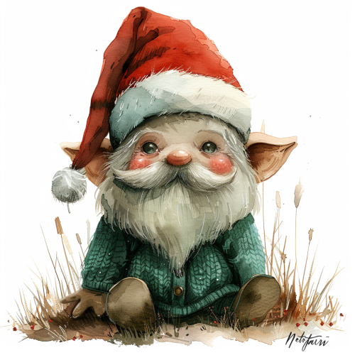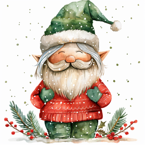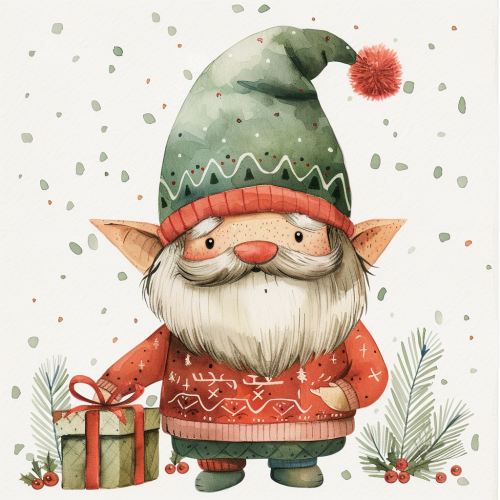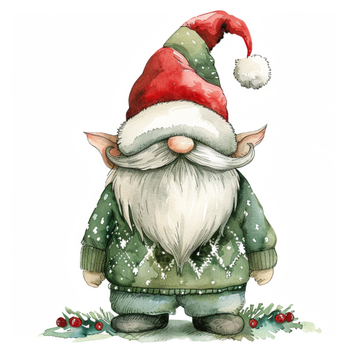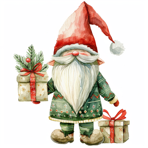 watercolor Christmas gnome wearing green christmas sweater with Christmas red santa hat and holding christmas presents, clipart, mary blair style, on white background --v 6.0 --s 250