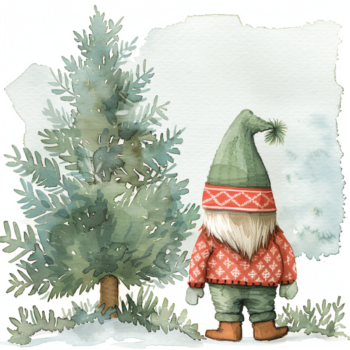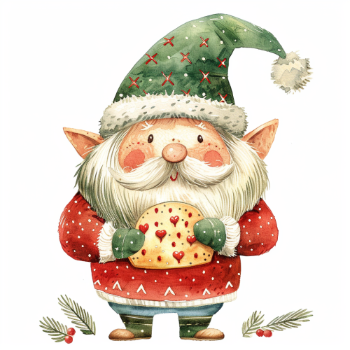 watercolor Christmas gnome wearing red christmas sweater with Christmas green santa hat and holding christmas present, clipart, mary blair style, on white background --v 6.0 --s 250