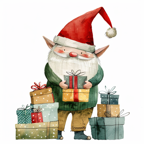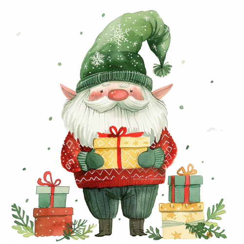 watercolor Christmas gnome wearing green christmas sweater with Christmas red santa hat and holding stack of christmas presents, clipart, mary blair style, on white background --v 6.0 --s 250