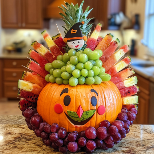 A creative Thanksgiving turkey fruit arrangement, featuring a pumpkin as the body with colorful fruit skewers forming the tail feathers. The skewers have vibrant layers of red grapes, green grapes, pineapple chunks, and watermelon pieces, arranged in rows for a striking effect. The front of the pumpkin has a playful turkey face and body illustration with a pilgrim hat. The display is set on a kitchen counter with warm indoor lighting, giving a festive and welcoming atmosphere.