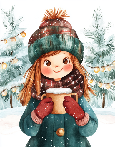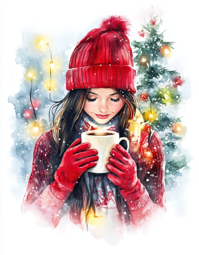 A cute girl in a red hat holding a mug, wearing gloves, a watercolor painting clipart with a winter theme, christmas background with Christmas tree and lights, light background --ar 45:58