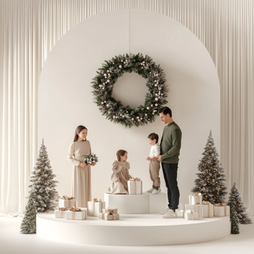 A photorealistic image of a Christmas-themed setup in minimalist style, a white cyclorama with a large Christmas wreath hanging on it, a family is also pictured mom, dad, and two children dressed in either light, beige clothing or dark green and black. --v 6.1