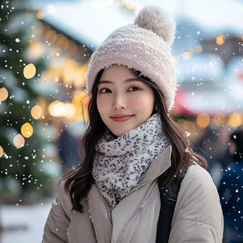 Close-Up shot, front view, hyper realistic, winter, afternoon, sunny, korean Solo, European country style, snowy town with Christmas tree, decorations, wide square, festival, lots of people on the street, beautiful fairytale atmosphere, smiling American woman, Canon EOS R5 with a 200mm lens, --style raw --v 6.1 --ar 1:1