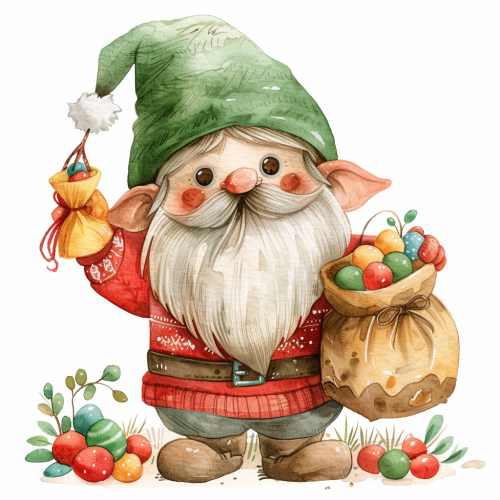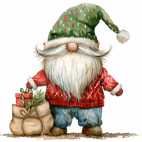watercolor Christmas gnome wearing red christmas sweater with Christmas green santa hat and holding a sack of christmas presents, clipart, mary blair style, on white background --v 6.0 --s 250