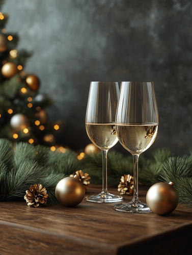 table with glasses of champagne and Christmas decorations with empty space from the left side photorealistic --ar 3:4 --style raw --stylize 350 --v 6.1